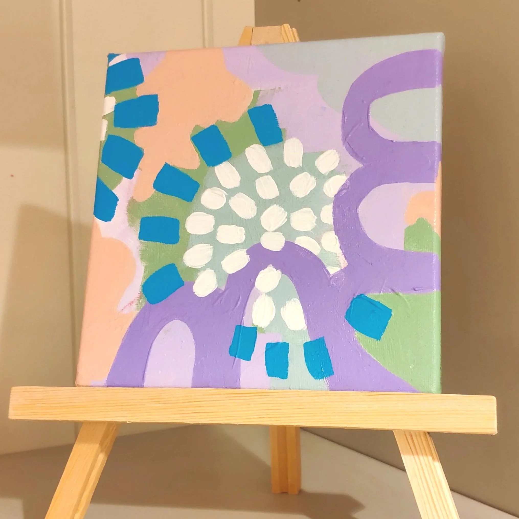 The big, brilliant purple (‘brilliant purple’ is the name of the paint, which is apt!) chunky arches ae not subtle at all, which is very me. The simple nod to nature that always appears in my abstracts somehow… in this one, its the simple pattern of white brushstrokes that radiate and spiral out from the middle, like layers of petals. The blocks of subtler colours in the background. and those vivid pops of blue!!!